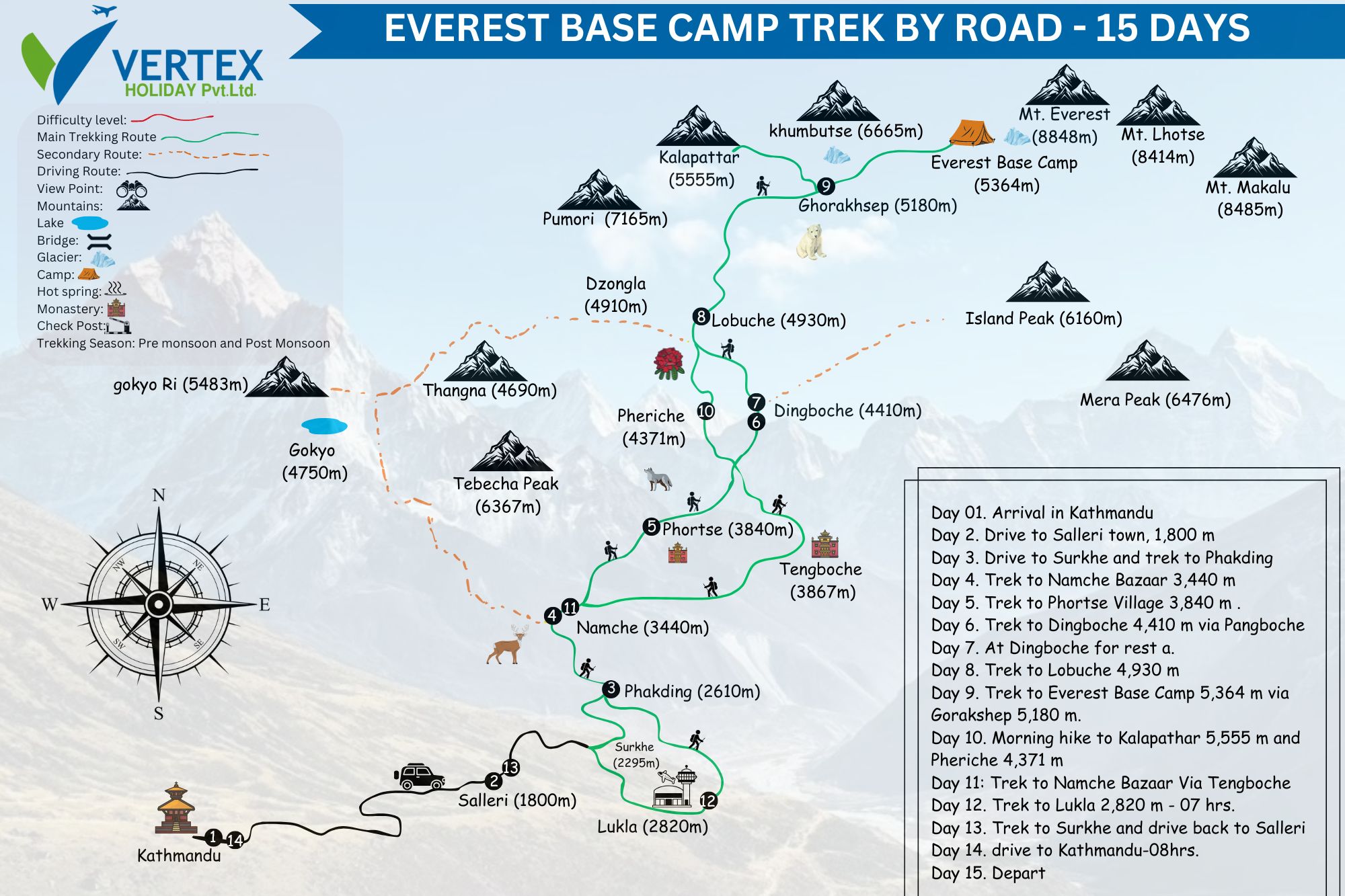 For the Everest base camp trek by road trip package Vertex Holiday provides knowledgeable guides, dependable porters, strict safety procedures, and individualized support from beginning to end to guarantee a trekking experience that is secure, comfortable, and responsible. Vertex Holiday Company and staff are dedicated to make your trip to the Himalayas easy, fun, and unforgettable, whether that means helping you with permits, eco-friendly activities, or emergency preparation.