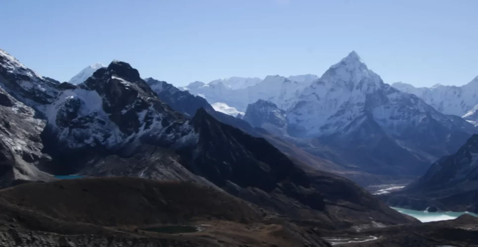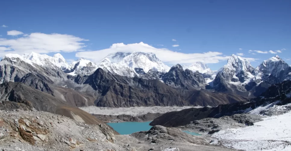 The panoramic view of Everest, Cho-Oyu, Gyachung, Lhotse, Nuptse, Makulu, and many other smaller peaks can be seen from the top of Gokyo Ri.