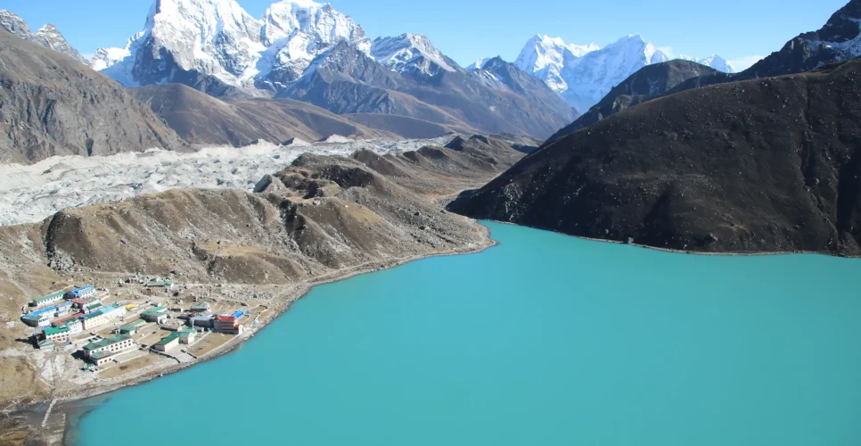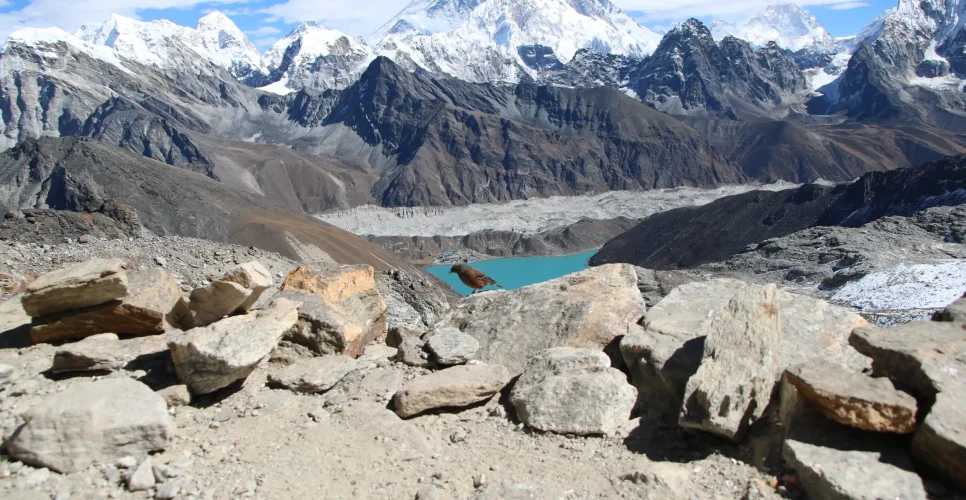 The longest Himalayan glacier in the world, Ngozumba glacier, can be seen from there. Exploring the natural wonders, we trek down to the Gokyo valley and rest.