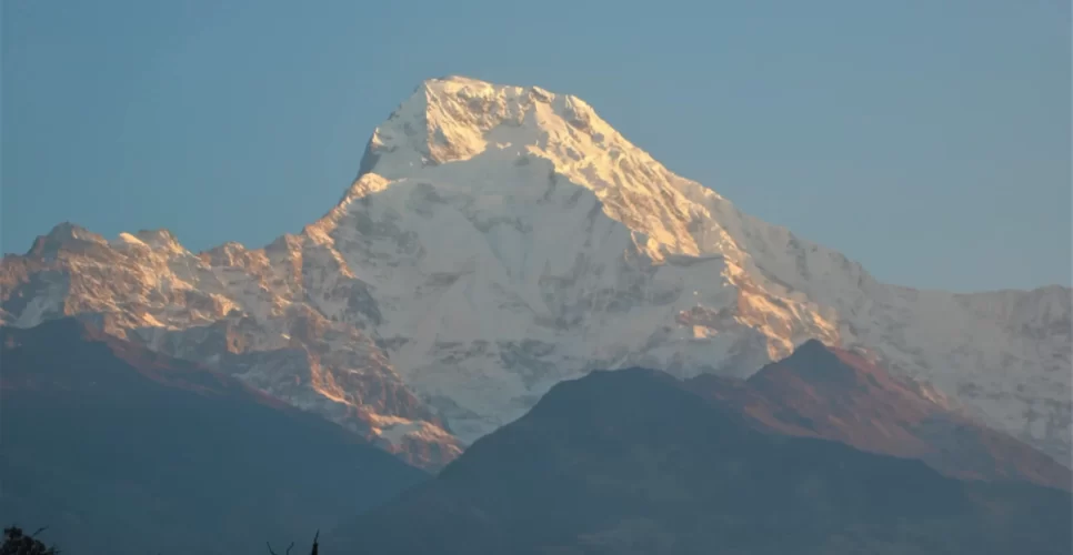 The range of peaks includes Dhaulagiri, Nilgiris, Annapurna Fang / Vara Shikar with A-I, A-II, III, and IV with majestic Machhapuchare Himal, the famed Fish-Tail peak.