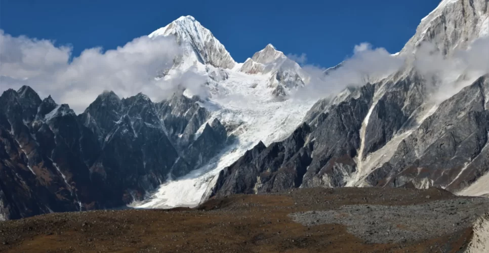 After breakfast, we descend to the River and cross over the wooden bridge. Our trekking trail leaves the river and ascends, where we cross a couple of glacial streams. The Larke Glacier is visible from here.
