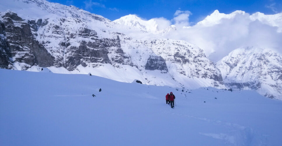 Hiking through snowy trail to ABC trek.